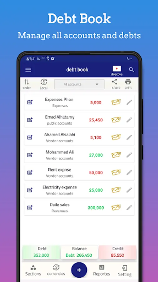 If you're searching for an all-in-one financial management solution to help manage your expenses, income, and debts, then look no further than Debt Book. Our app is the perfect tool for anyone who wants to take control of their finances. With Debt Book, you can easily track your expenses, income, and debts, create budgets, generate financial reports, and more. Whether you're a business owner, a student, or just looking to manage your personal finances, Debt Book has everything you need to stay on top of your finances. Download Debt Book today and start managing your accounts and debts with ease.