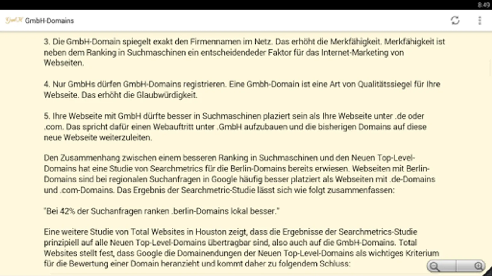 Another study of total sites in Houston shows that the results of Searchmetrics study are in principle applicable to all new top-level domains, including the GmbH domains. Total websites notes that Google draws on the domain extensions of the new top-level domains as an important criterion for evaluating a domain and therefore concludes: