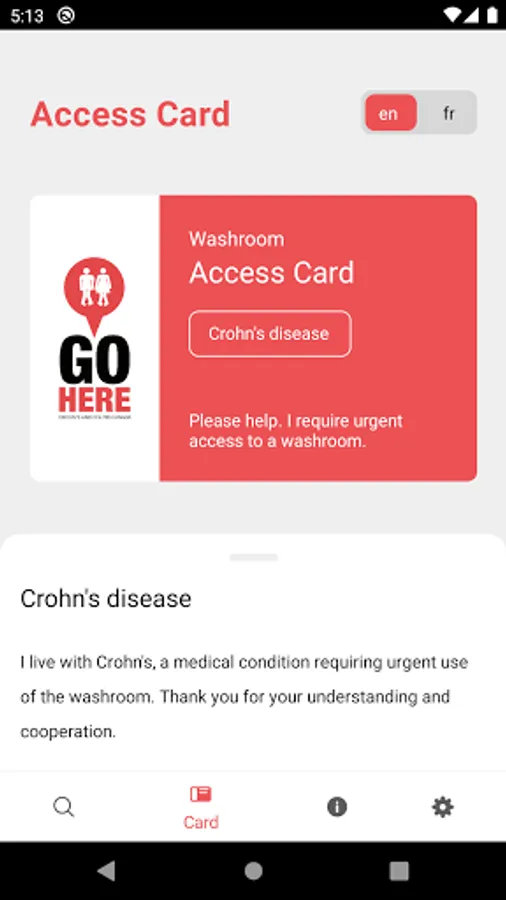 Need to find a washroom fast? GoHere is a free app which helps you find washrooms in the GoHere Initiative’s participating businesses and government buildings closest to you, or along the route to your destination. You may also use the Washroom Access Card to quickly explain your medical need. This app is designed to help users with incontinence issues, in particular those with Crohn's disease or ulcerative colitis - the two main forms of inflammatory bowel disease (IBD). GoHere is provided courtesy of Crohn's and Colitis Canada. Visit us at www.go-here.ca and www.crohnsandcolitis.ca for more information.