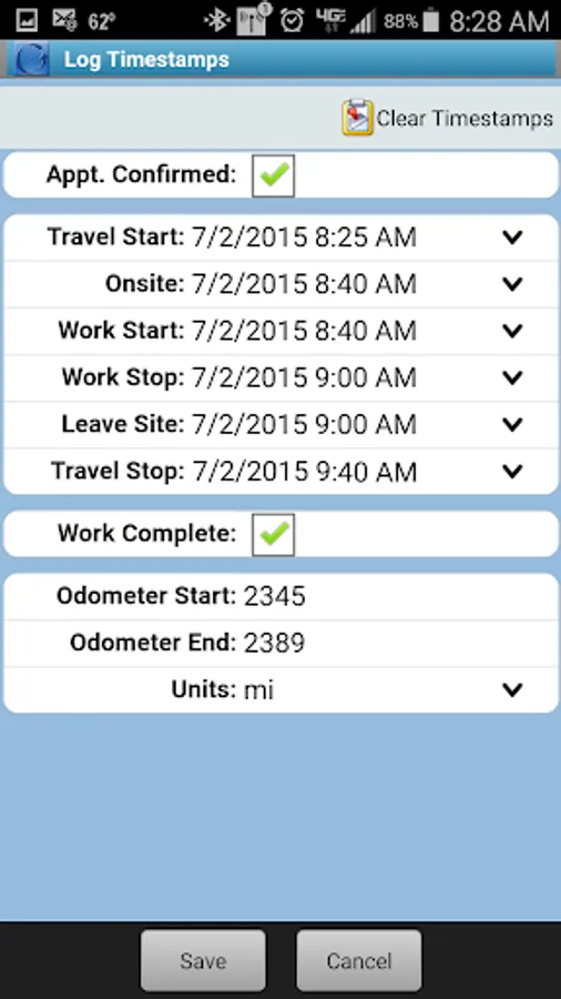Timestamps – Timestamps are collected by the field technicians, each of which allows for more information to be logged. GoServicePro’s mobile application has six default timestamps: Travel Start, Onsite, Work Start, Work Stop, Leave Site, and Travel Stop. These collect the current time and date.