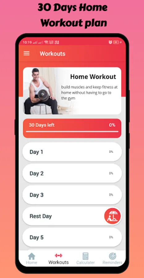 Exercises - 30 days Workout from day 1 - It shows all exercise what you should do and set the cycles and start your workout and a rest day is there for every 3 days complete your 30 days challenge.