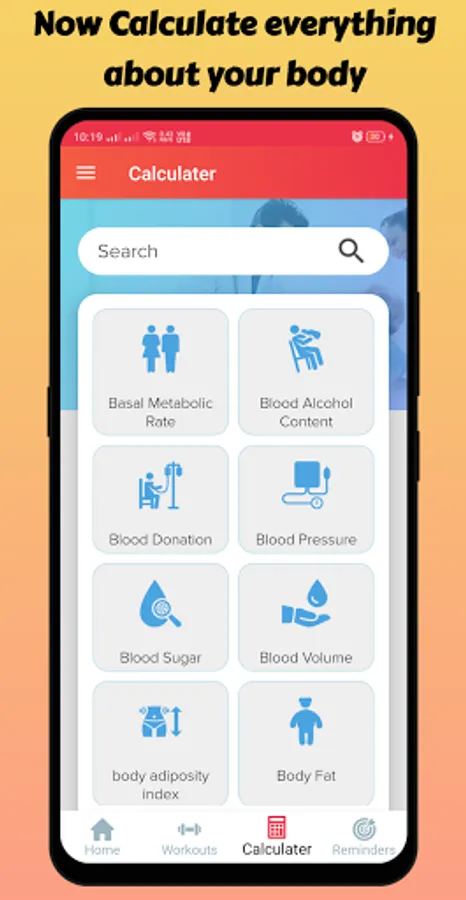 Basal metabolism rate, Blood donation, Blood alcohol content, Blood pressure, Blood sugar, Blood volume, Body adiposity index, Body fat, Body frame size, Body mass index, body surface area, Bruce treadmill, Calorie burn, Chest to hip ratio, Children height predictor, Cholesterol ratio, Daily calorie intake, Daily water intake, Heart rate, Ideal body weight, Kids growth, Lean body mass, Menstrual & Ovulation, Pregnancy due date, Resting metabolism rate, Smoking risk, Waist to height ratio, Waist to hip ratio.
