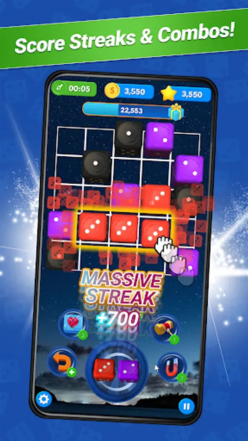 Dice Match N’Merge is simple, and addictive! This puzzle game will have you playing for hours, earning combos and bonuses to your heart’s content! In this puzzle mobile game, you drop dice on the board and match them with dice of the same number and color!