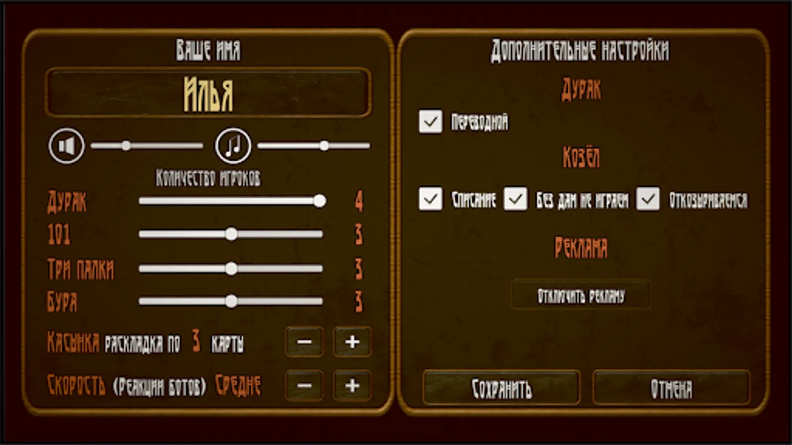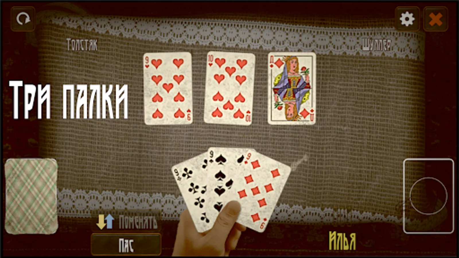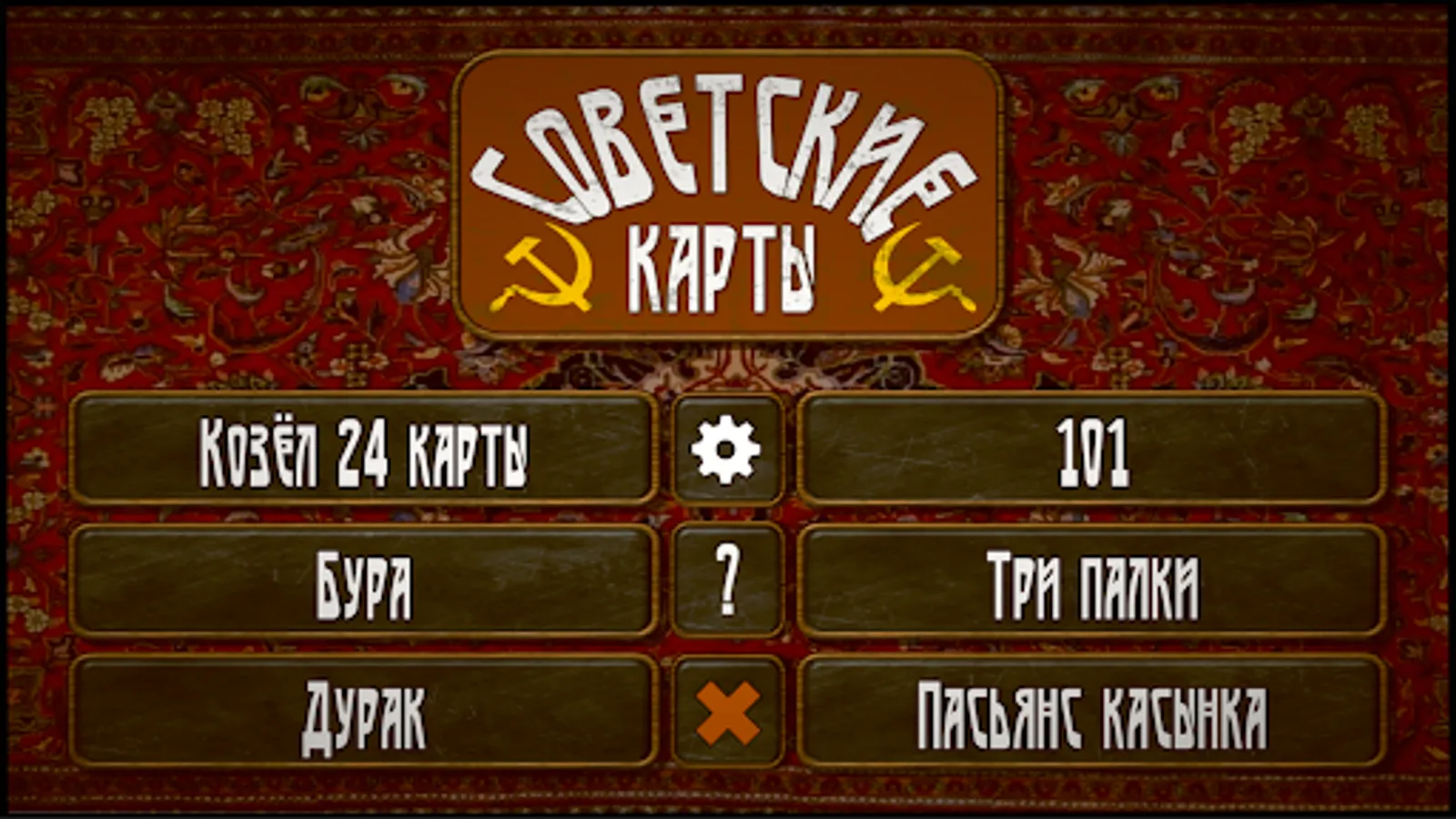 A collection of Soviet card games, including 6 forgotten and not very types of card competitions. Goat, Bura, Fool, 101, Three sticks and Solitaire kerchief - this is a list of games that you can plunge into in our collection. We tried to recreate the atmosphere of those years, so that you would be pleased to play with a touch of nostalgia. Have a good game !