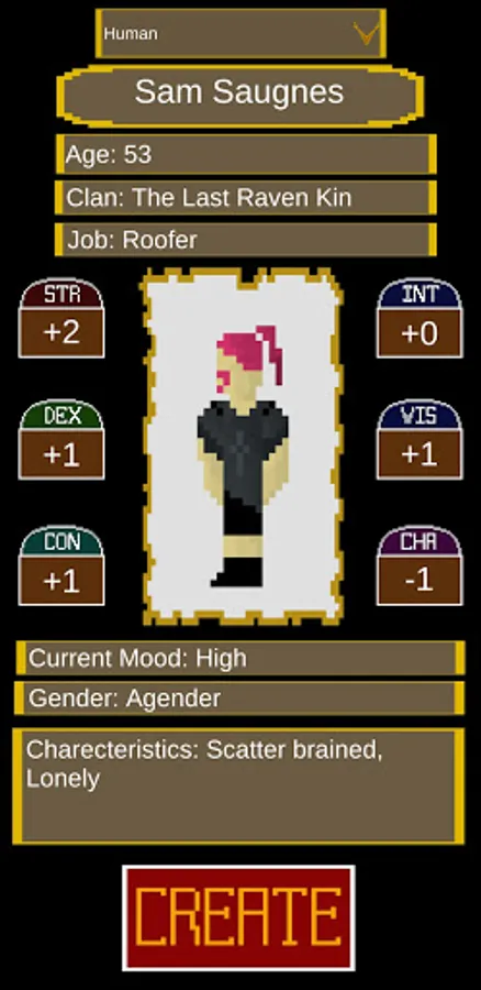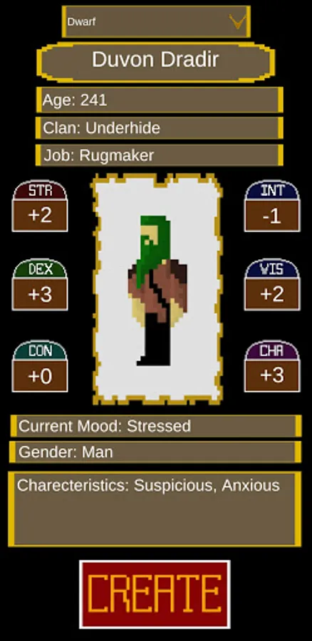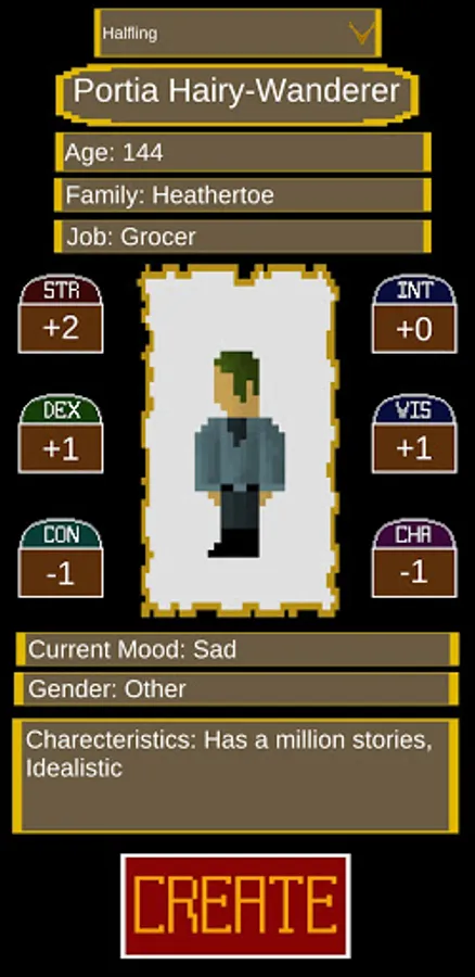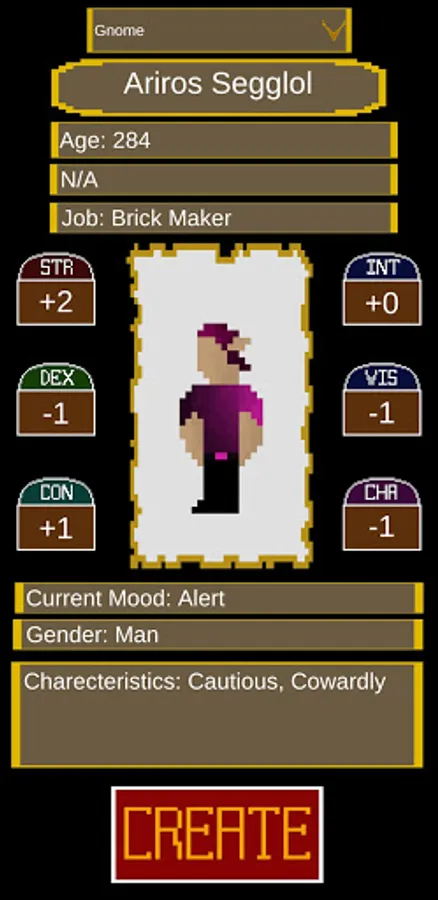 The app will give you a very brief summary of an NPC designed to be most compatible with fifth edition dungeons and dragons. for each NPC you will get: