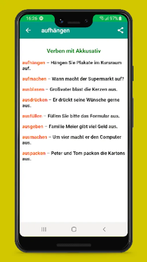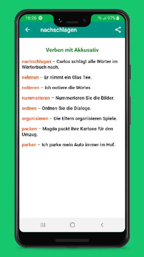 Here you can find grammar exercises on verbs with accusative. This corresponds to the following levels DaF A1, A2, B1, B2. This app is perfect for anyone looking to freshen up their German language skills or for beginner learners.