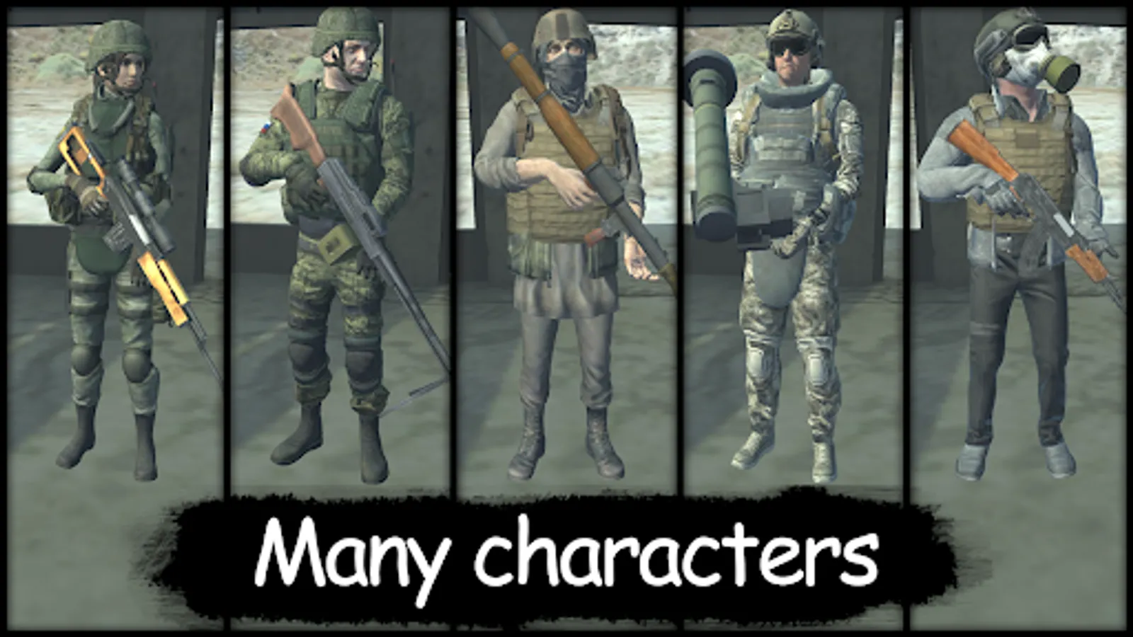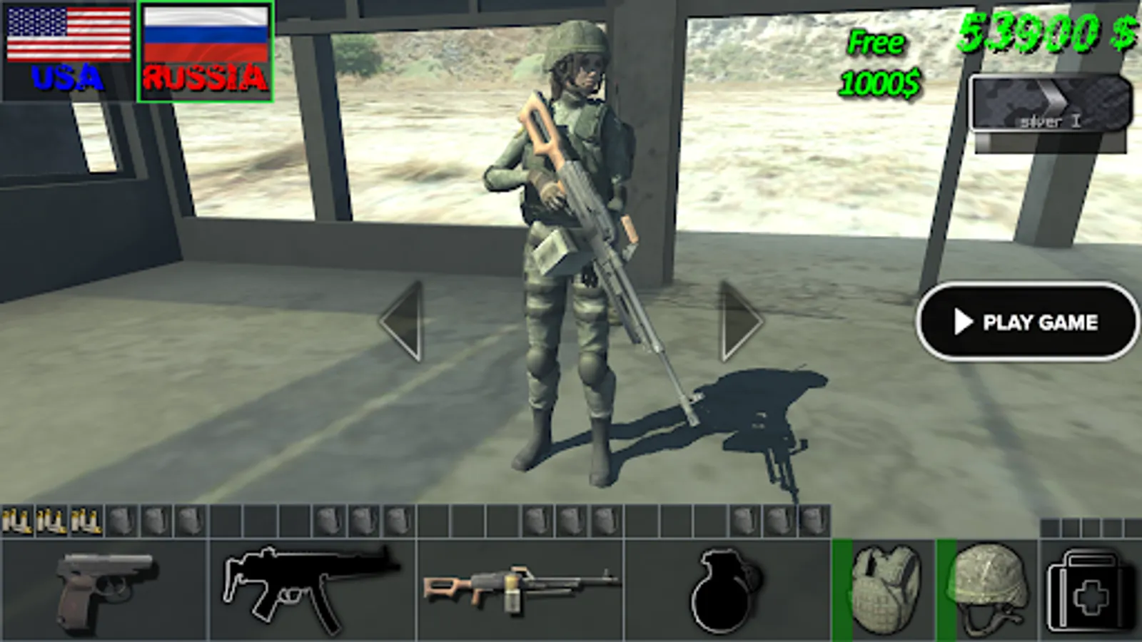 - 4 teams ("USA", "RUSSIA", "Terrorists", "Crazy Team")