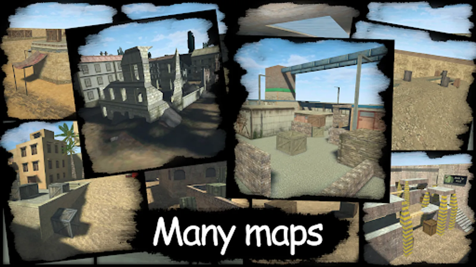 - 13 maps ("Ruined City", "Dust2", "Dust2X2", "AWP India", "$ 2000", "Sity Street", "Factory", "Ice World", "Snow", "Fortification", " Dust4 "," Trenches "," Containers ")