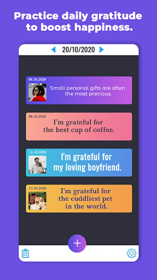 🌸 Upload photos from your gallery and write gratitude affirmations on them or use motivational quotes with images from our collection.