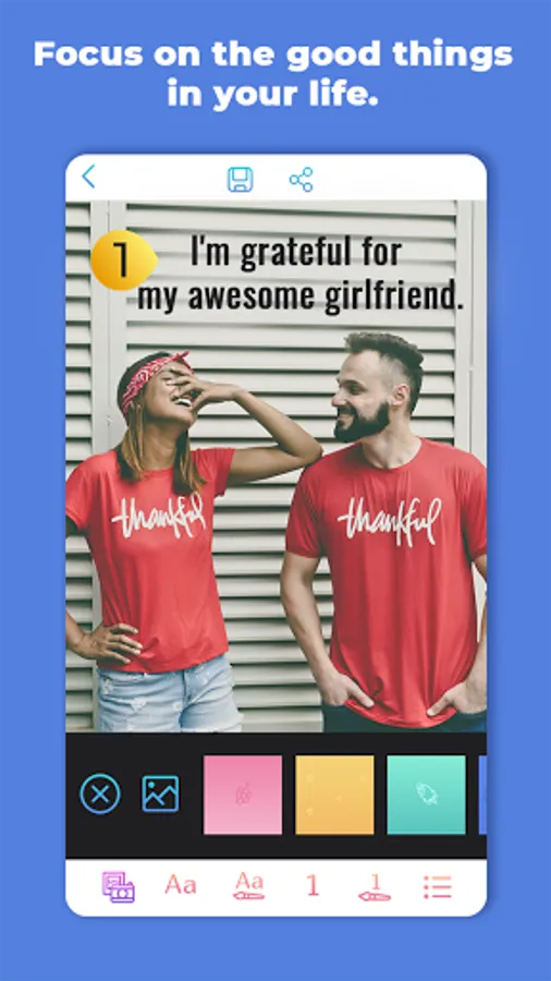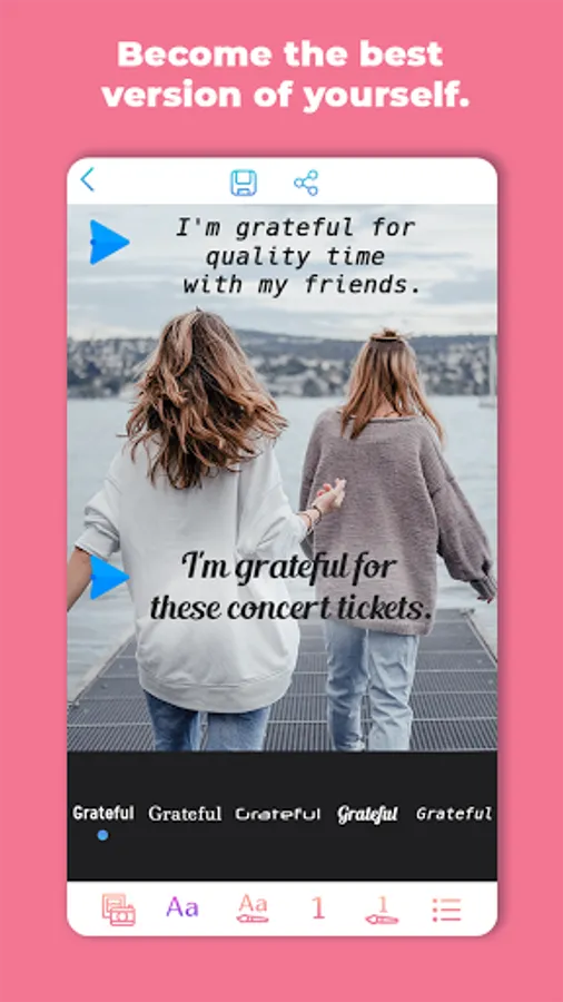 Do you have so much in life to be grateful for, but you need the “five minute journaling app” to put it into words and create unique motivational quotes daily? We've got the perfect self-help application for you! “Gratitude App”: Journal Daily Affirmations free can help you come up with daily gratitude quotes and have fun while doing it. Use some of our predefined positive affirmations or use your own words to create the best inspirational messages with pictures. Exercise positivity every day in your own personal self care journal and adopt a positive lifestyle change. Add text to photos of yourself, your loved ones, or whomever your heart prefers and customize it in this extraordinary “gratitude diary app”. Enjoy!