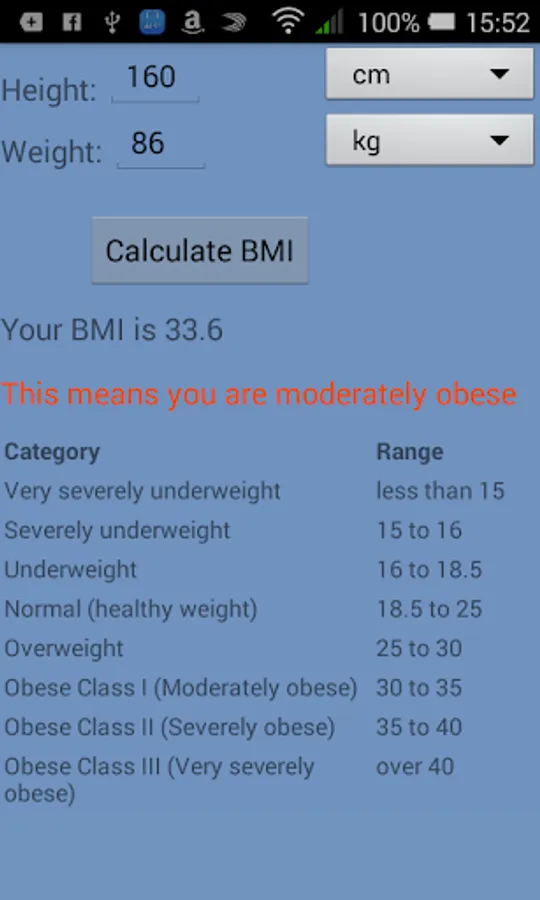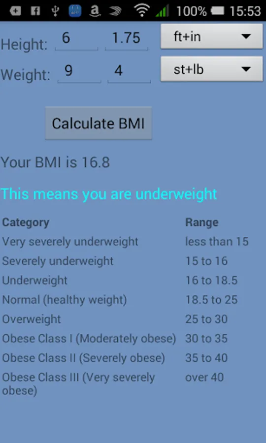 You can enter weight in pounds, kilograms or stones and pounds (lb, kg or st+lb).