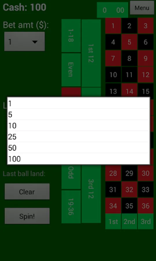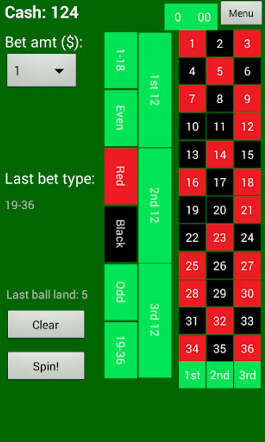 Select a bet amount (1 to 500), a bet type and then click Spin! to play.