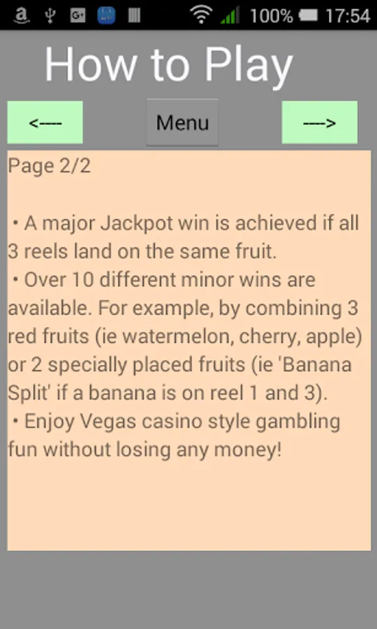 Over 10 different minor wins are available. For example, by combining 3 red fruits (ie watermelon, cherry, apple) or 2 specially placed fruits (ie 'Banana Split' if a banana is on reel 1 and 3).