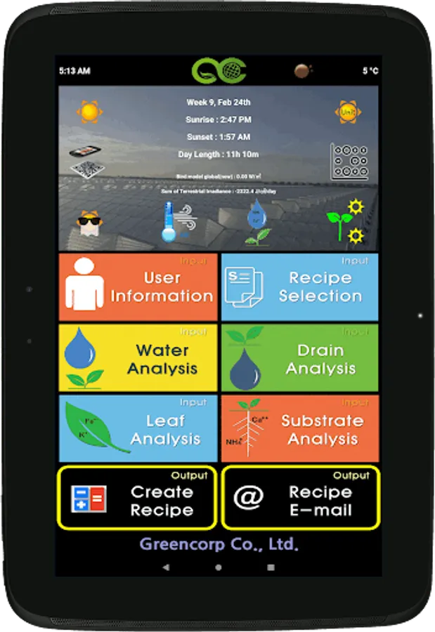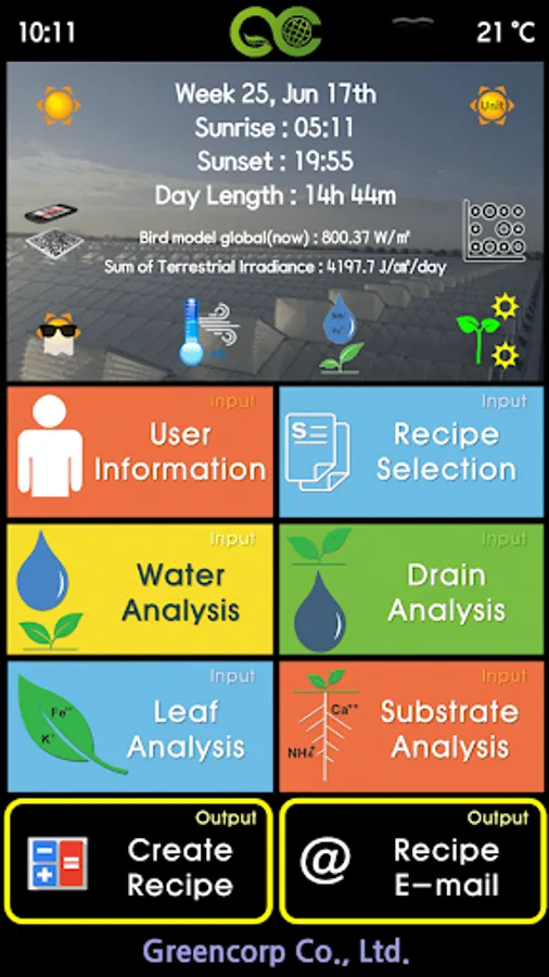 In addition, it has other useful functions for monitoring environmental conditions such as outside air temperature, terrestrial irradiance and it’s sum, day length, time of sunrise and sunset, percent of the light transmission, light units conversion, the study of moisture in air, Carbon Dioxide(CO₂) Supply Capacity and Volume Calculation, Growing System & Session Size of the Irrigation Calculation and so on.
