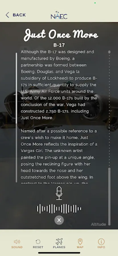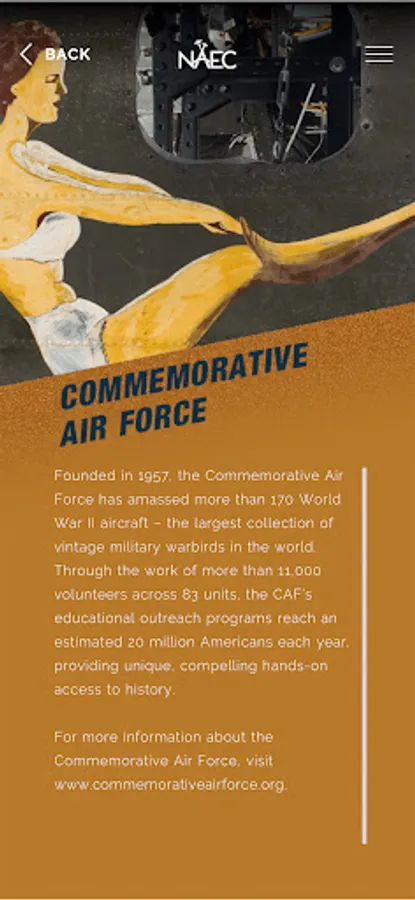 The NAEC Nose Art Experience acts as the official app of the NAEC. It features an inspiring AR experience of World War II planes and information about the National Aviation Education Center, the Commemorative Air Force, and the historic Nose Art Exhibit.