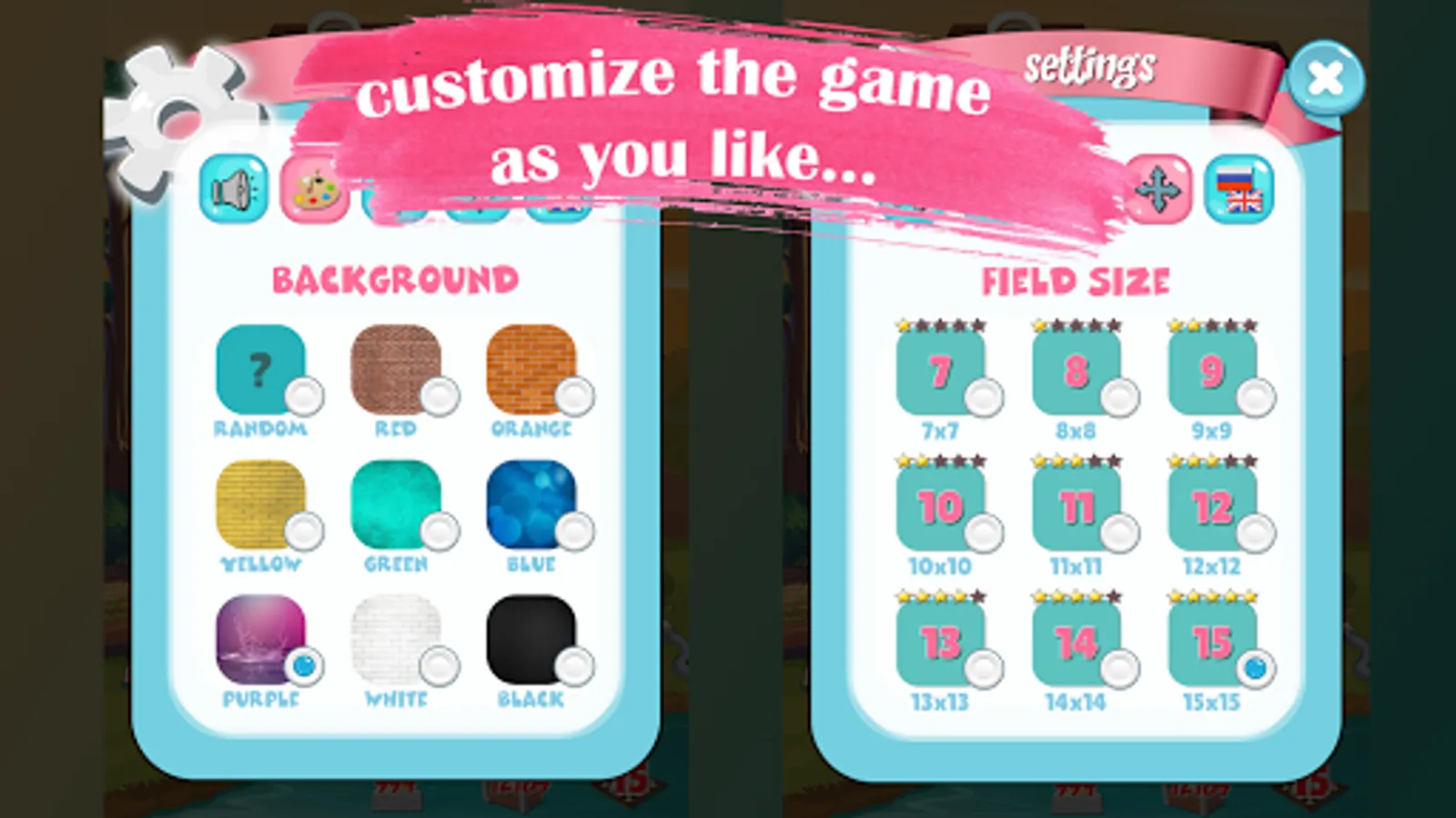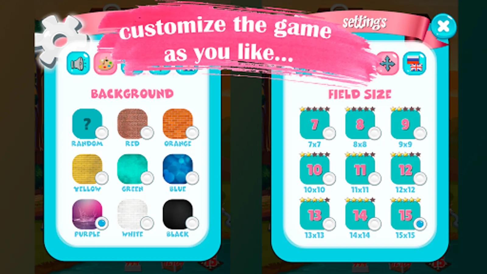 You can play on different field dimensions - from 7x7 to 15x15 cells.