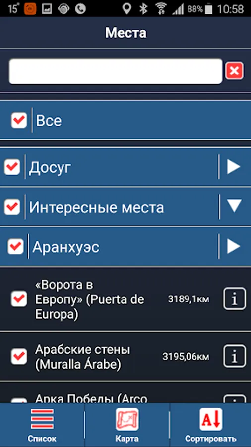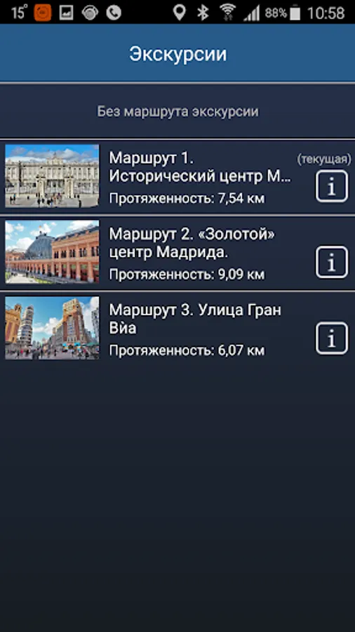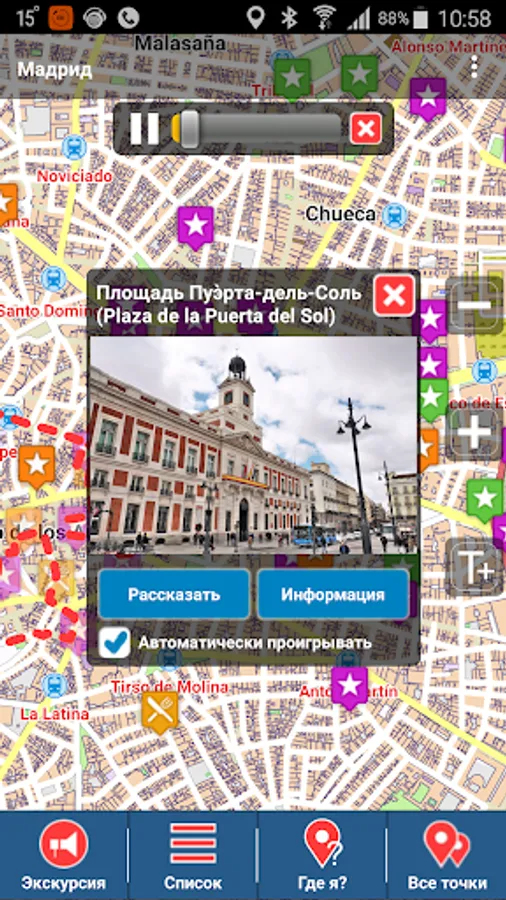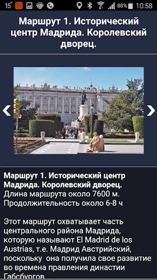● WALK around Madrid and the outskirts of the city. free walk mode for those who like to choose his direction. Moreover, not all the interesting places that are worth visiting in Madrid and the surrounding area can be included in sightseeing tours. Make your own plan for a walk, just by selecting the desired locations in the directory, and they will be immediately displayed on the map. At the same time the other objects, you can temporarily remove the card.