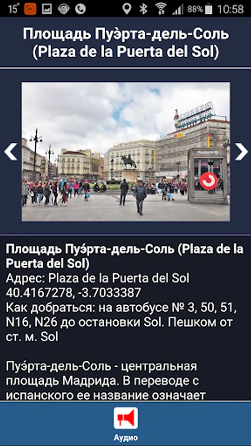 ● Audio guides in Madrid. Stories audioguide sounded a professional speaker. Listen to stories, without detracting from the sightseeing and not wasting time. It is not necessary once again to spoil the sight reading on the move text on a small screen.