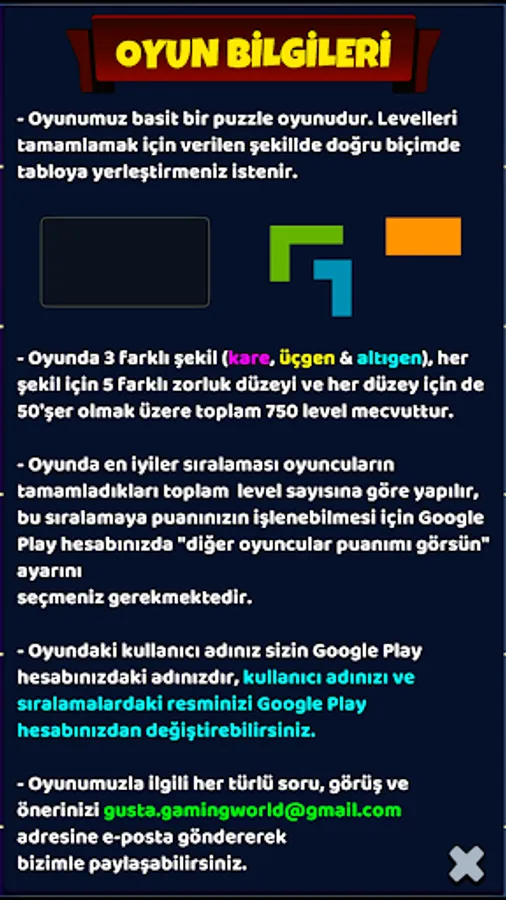 Our game is a fun and educational puzzle game that is prepared on the basis of combining the given shapes to form a whole, appealing to everyone, supporting the development of intelligence and memory.