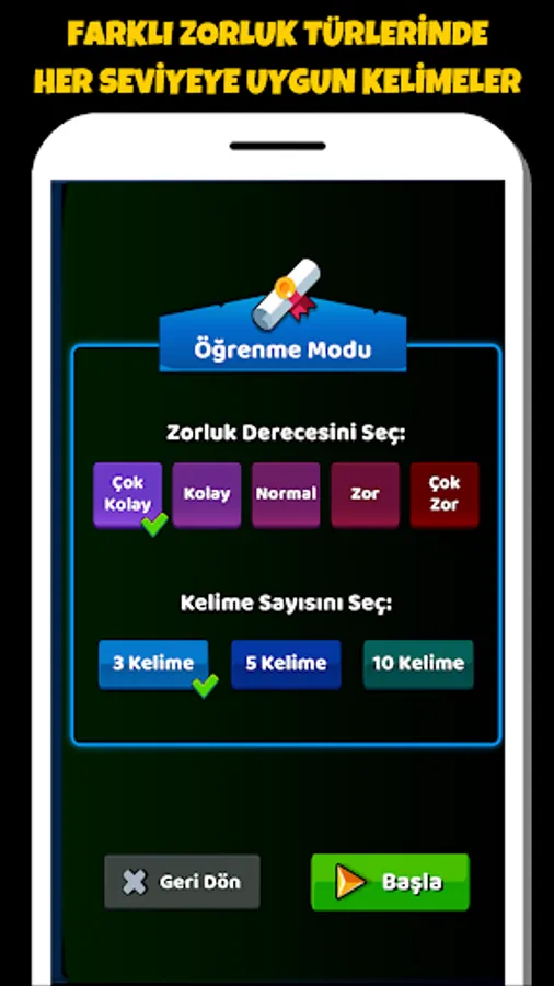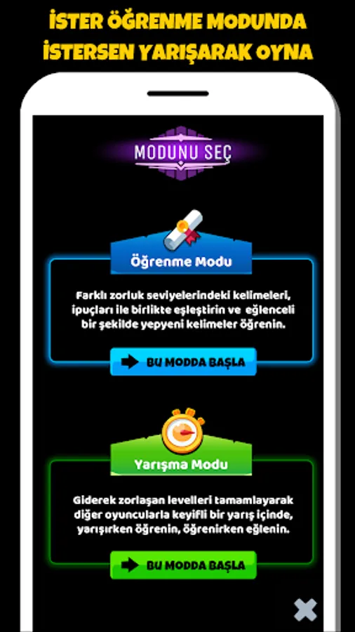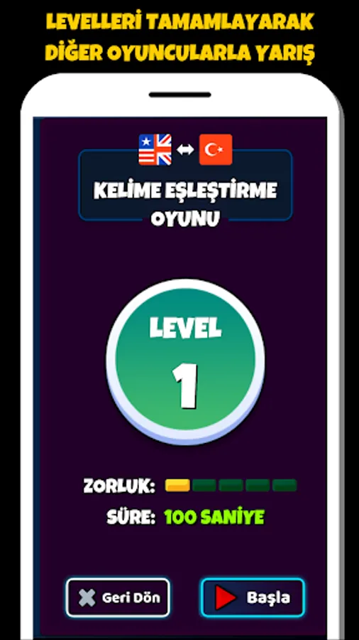 You can either learn new English words with hints in learning mode or in competition mode.
