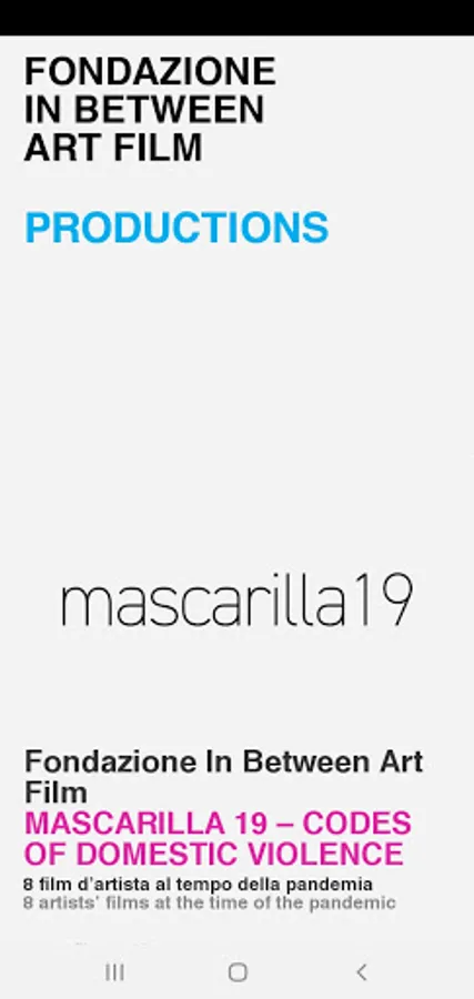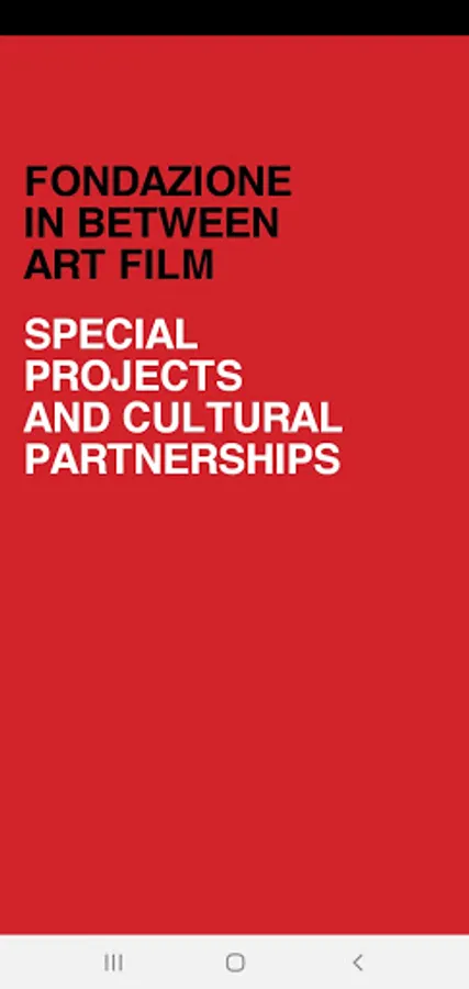 In Between Art Film has been supporting leading institutions and promoting important cultural partnerships including: vice versa Italian Pavilion, 55th International Art Exhibition of Venice Biennale (Venice, 2013); Biennale de l’Image en Mouvement (Centre d’Art Contemporain Geneva, 2016); Tate Film (London 2017); Maxxi Videogallery (Rome, 2017); Il Mondo Magico Italian Pavilion, 57th International Art Exhibition of Venice Biennale (Venice, 2017); Documenta 14 (Athens - Kassel, 2017), Lo Schermo dell’Arte (Firenze, 2017); Dhaka Art Summit (Dhaka, 2018), Manifesta 12 (Palermo, 2018).