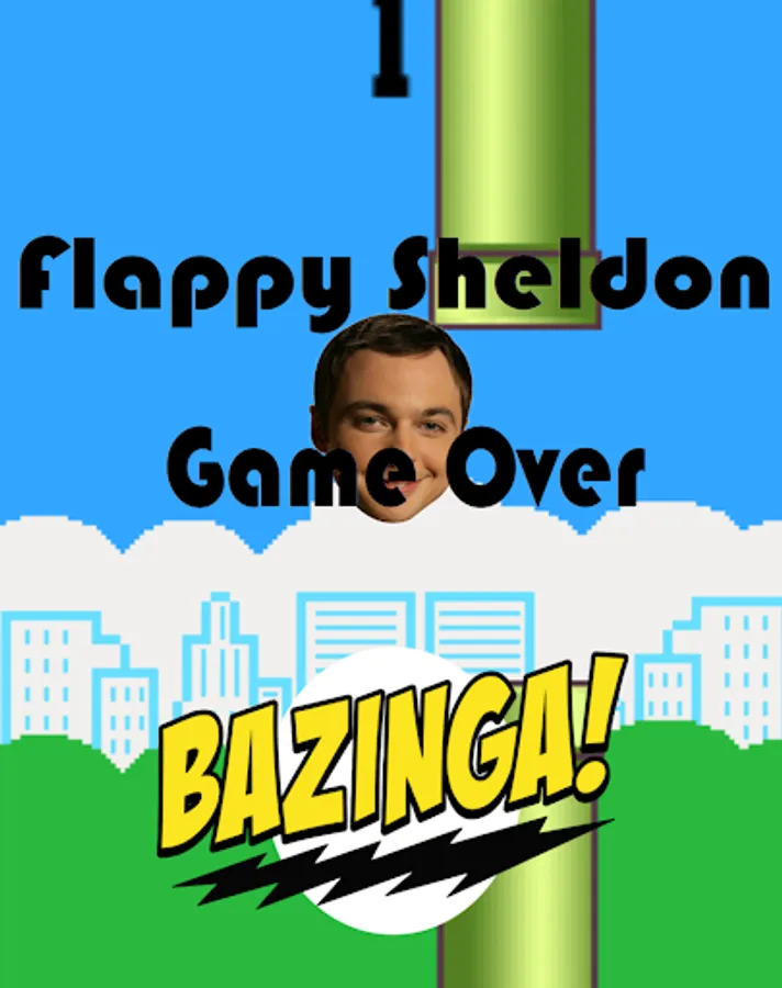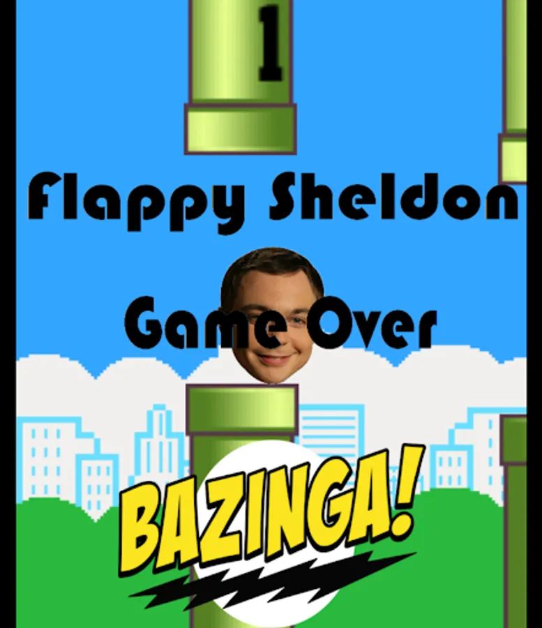 Flappy Sheldon is a version of the popular mobile app "Flappy Bird," though instead of the bird as the protagonist, there is the popular character, Sheldon Cooper, from the popular sitcom, "The Big Bang Theory." Players must tap the screen to make Sheldon fly and must make him stay in between the pipes, while not hitting the floor. The "Bazinga button" appears when one fails and will restart the play. There is also a scoreboard to see how many pipes you have gone through. Created by Ryan Javid. BAZINGA! And don't forget...Our whole universe was in a hot, dense state. Then nearly fourteen billion years ago expansion started, wait. The earth began to cool, the autotrophs began to drool. Neanderthals developed tools. We built a wall (we built the pyramids). Math, science, history, unraveling the mysteries. That all started with the big bang! Furthermore, It's not even morning I got breakfast on my mind