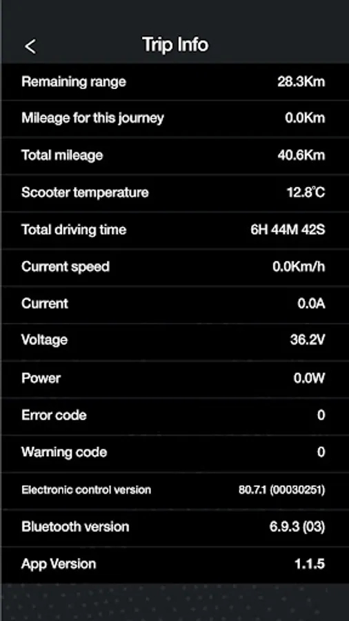 View your eScooter’s latest trip information, anything from total driving time, to voltage and power statistics. The device firmware can also be upgraded by the user (internet connection required).