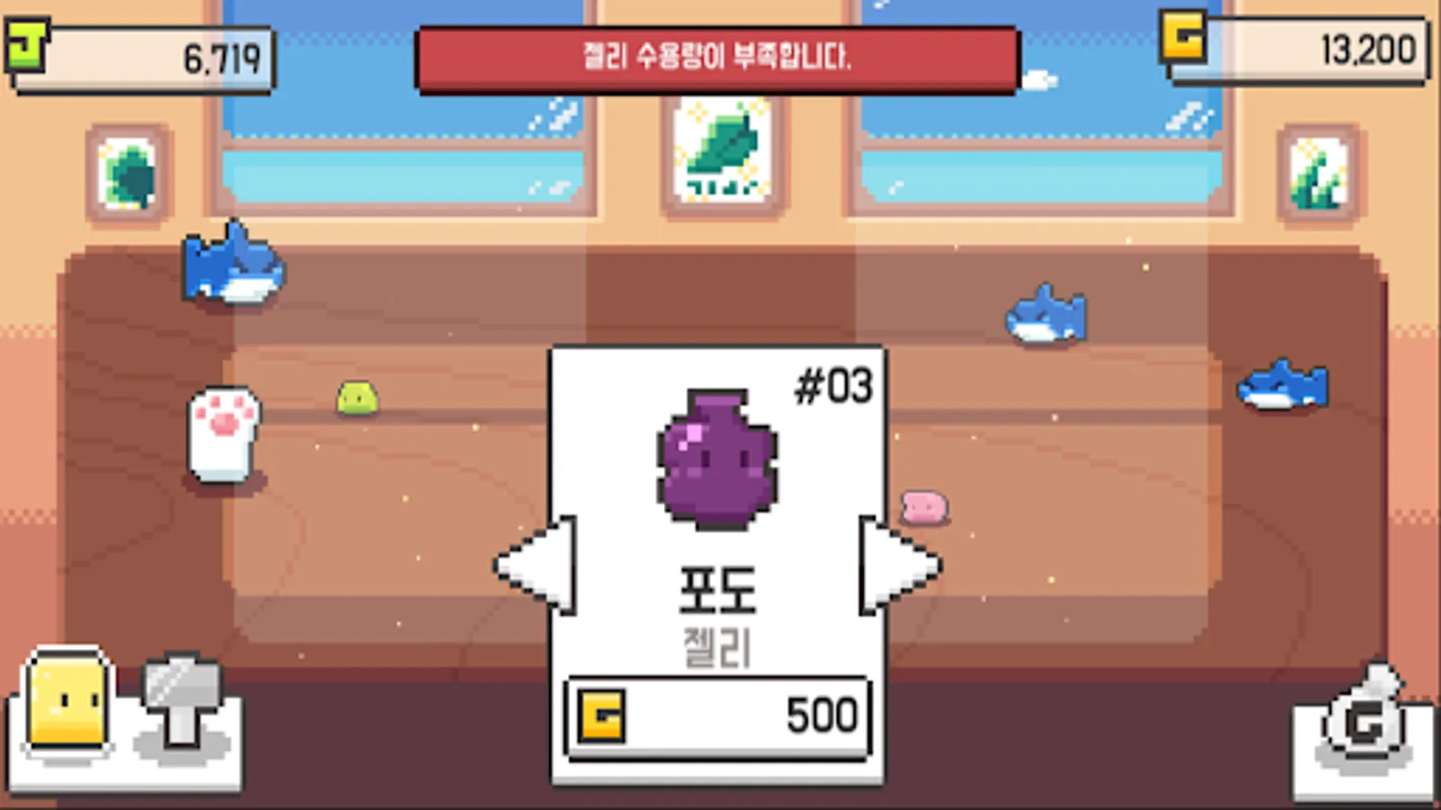 Jelly has a total of 3 stages, and each time you click a certain number, the size increases and the number of gelatin you get increases. The higher the level, the greater the amount of gold you can get from selling.