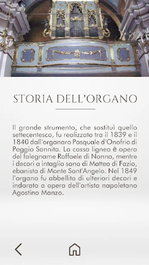 The pipe organ, which replaced the eighteenth-century one, was built between 1839 and 1840 by the organ builder Pasquale d'Onofrio from Poggio Sannita. The wooden case is the work of the carpenter Raffaele di Nonno, while the intaglio decorations are by Matteo di Fazio, a cabinetmaker from Monte Sant'Angelo. In 1849 the organ was embellished with further decorations and gilded by the Neapolitan artist Agostino Manzo.