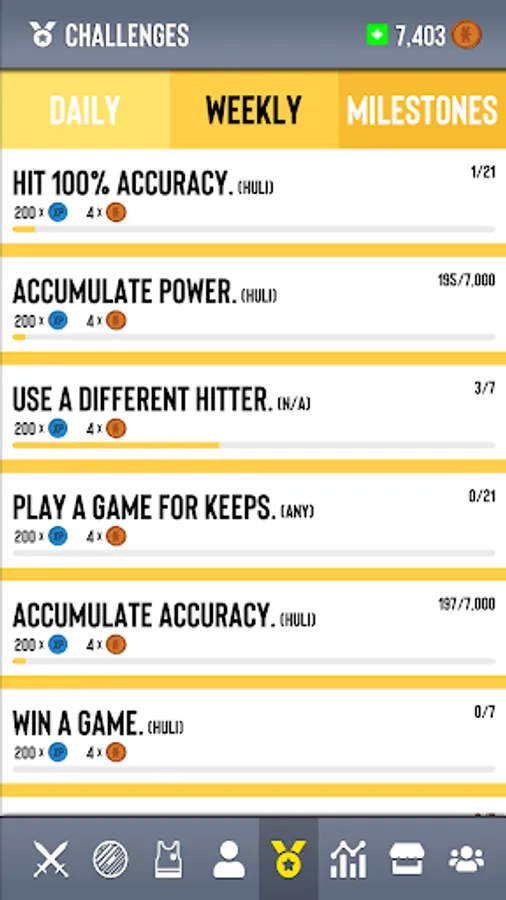 • Weekly - Every week Huli will issue you 7 Weekly Challenges. These challenges will take longer to complete but will reward you with more milk caps, experience and currency.