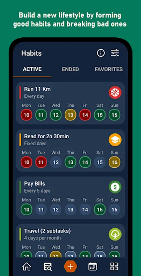 Create habits for a variety of distinct categories, each with specific goals set to your choosing.