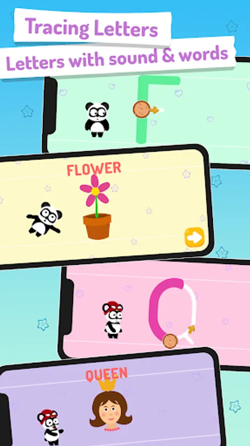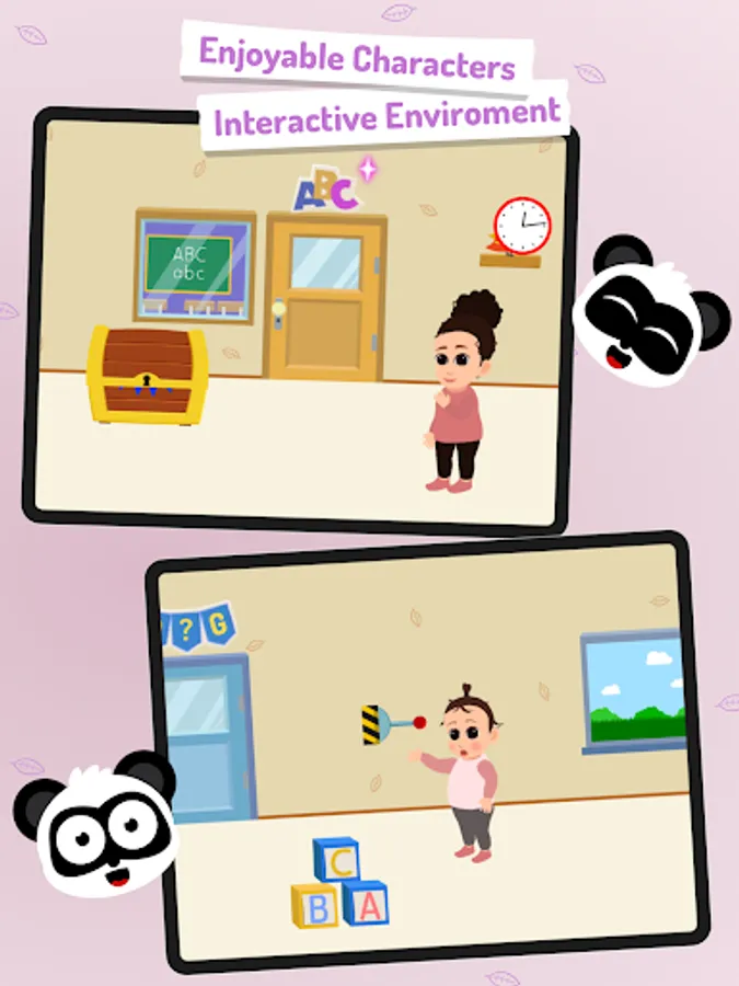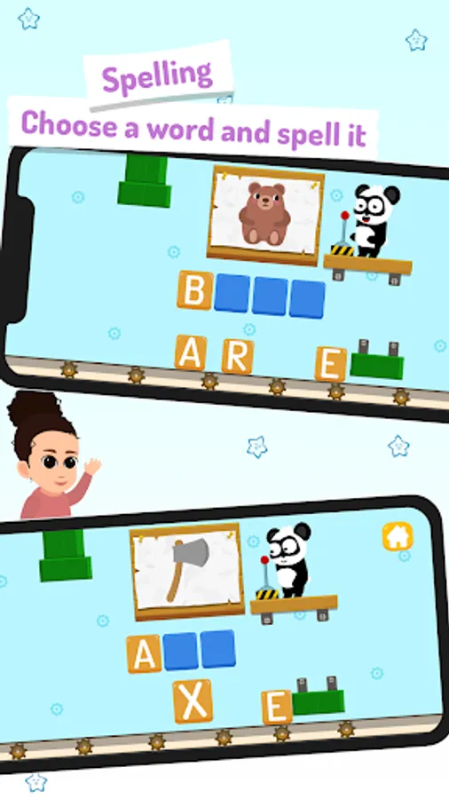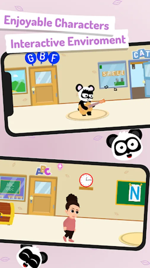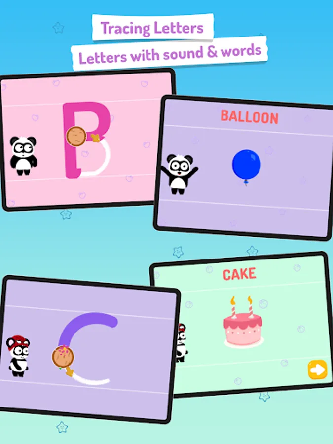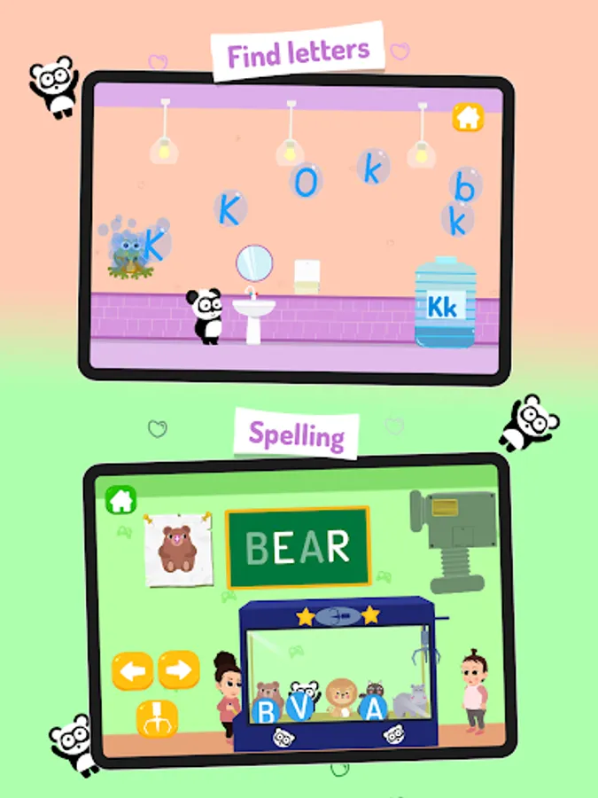 Additionally, this abc learning app features several spelling games witch introduce kids to simple spelling, complete a word and unlock a new one. Learn letters is filled with interactive hidden environment and funny panda characters designed to ignite childrenΒ΄s curiosity.