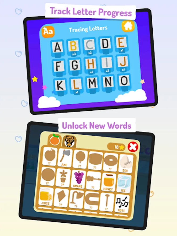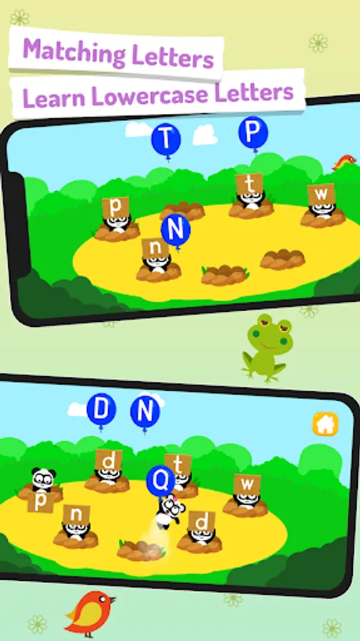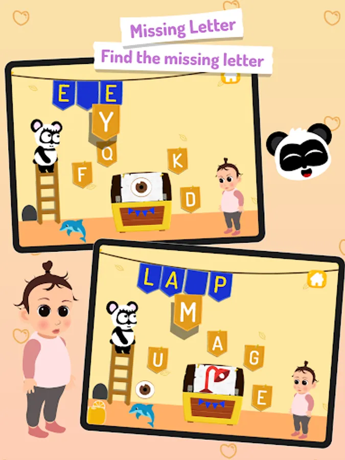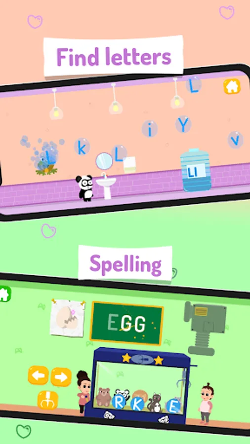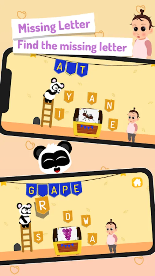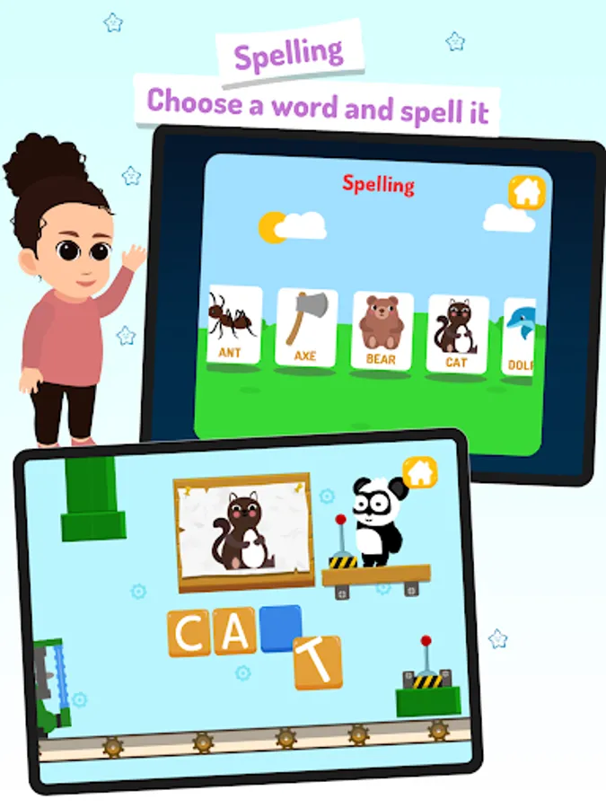 Additionally, this abc learning app features several spelling games witch introduce kids to simple spelling, complete a word and unlock a new one. Learn letters is filled with interactive hidden environment and funny panda characters designed to ignite childrenΒ΄s curiosity.