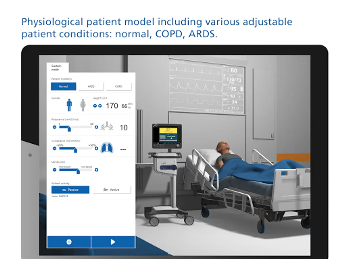 • Physiological patient model including various adjustable patient conditions: normal, COPD, ARDS