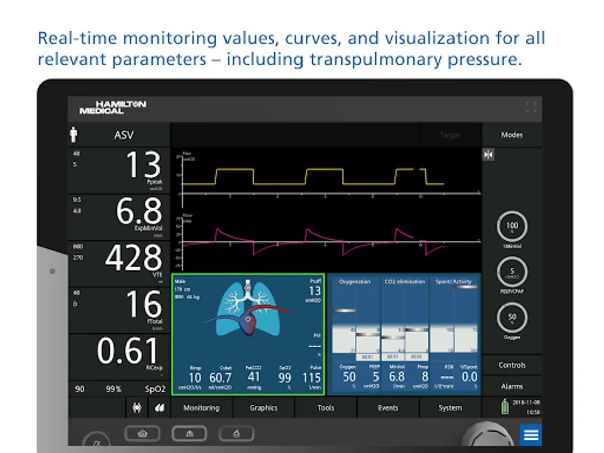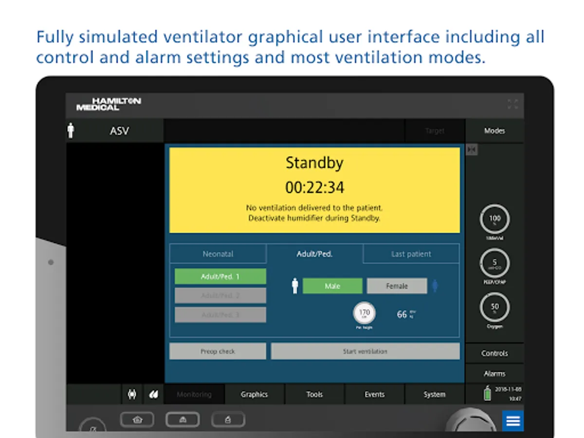 • Fully simulated ventilator graphical user interface including all control and alarm settings and most ventilation modes