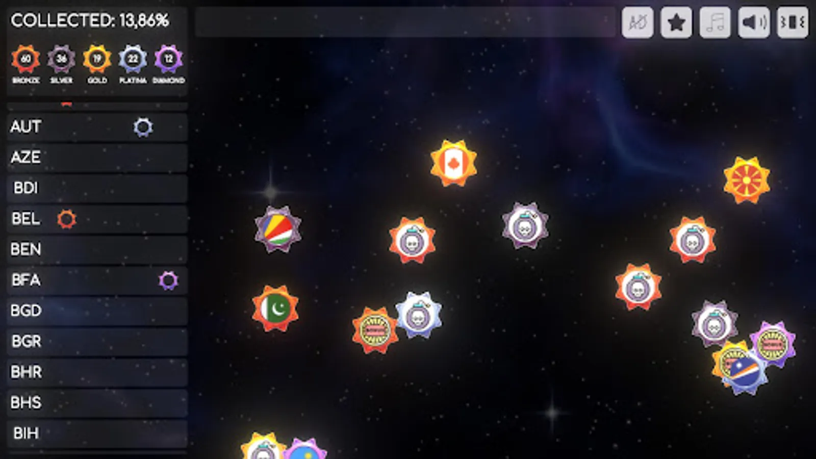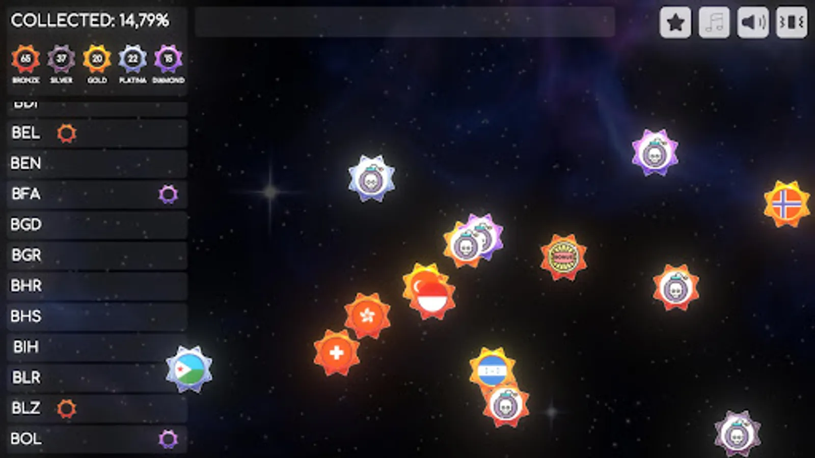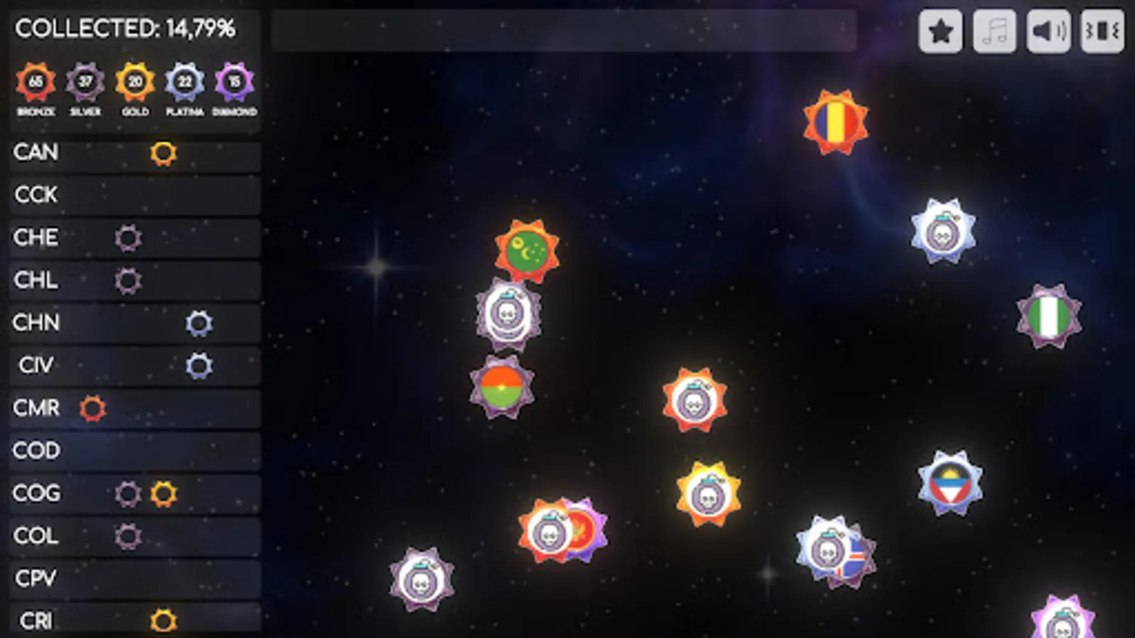 Immerse yourself in the sheer joy and excitement as you witness a kaleidoscope of colorful marbles adorned with flags, soaring gracefully across the expansive game field. Your mission, should you choose to accept it, is to deftly and swiftly click on the country's icon, defying the boundaries of language and culture, and adding it to your ever-expanding and illustrious collection. The thrill of collecting intensifies as each country offers five distinct levels of difficulty, ranging from the attainable Bronze to the illustrious Diamond. This delightful variety ensures that the game stays engaging and dynamic, always keeping you on your toes.