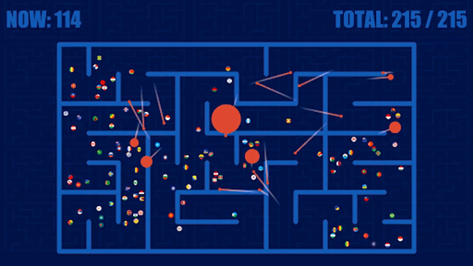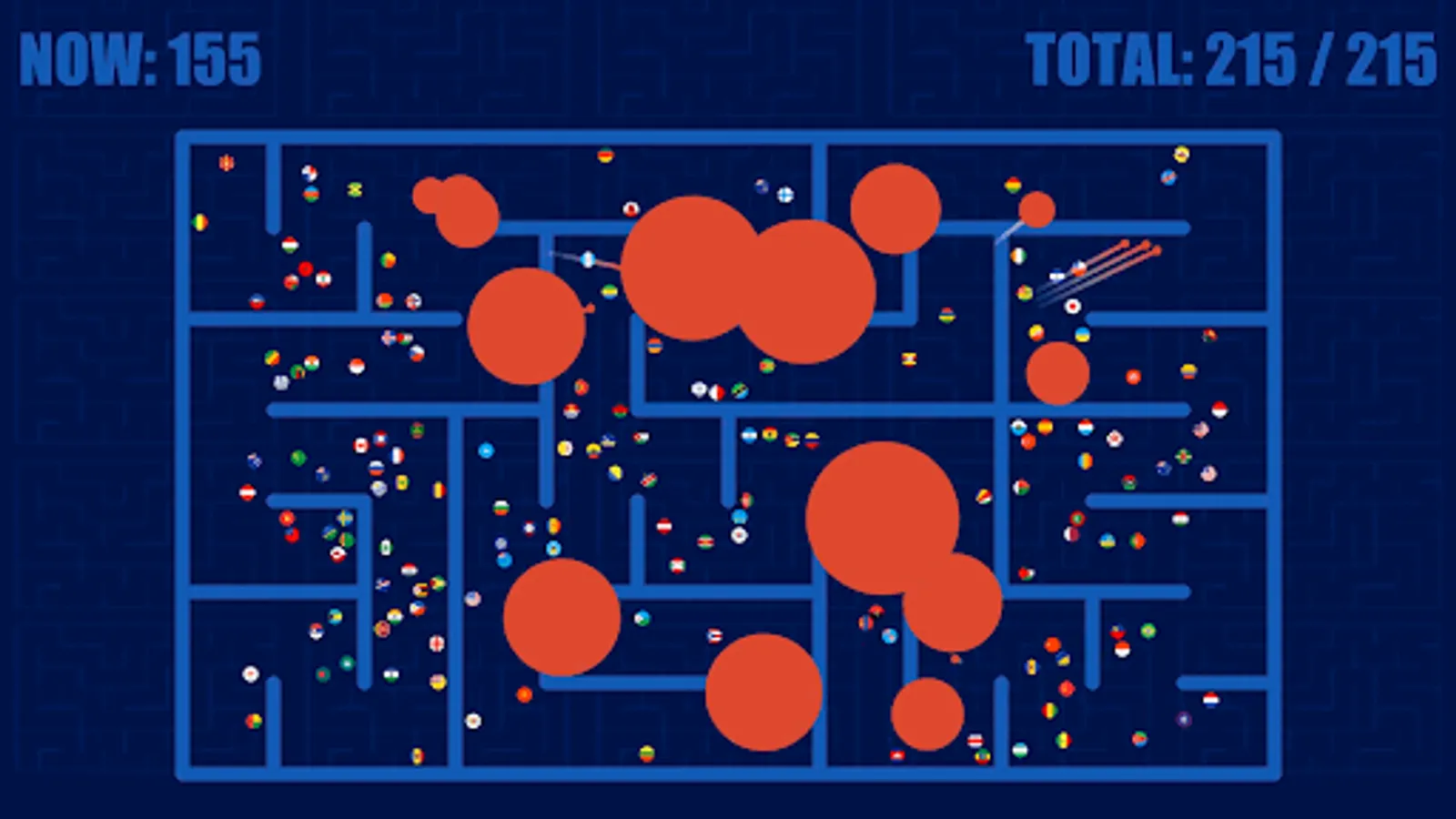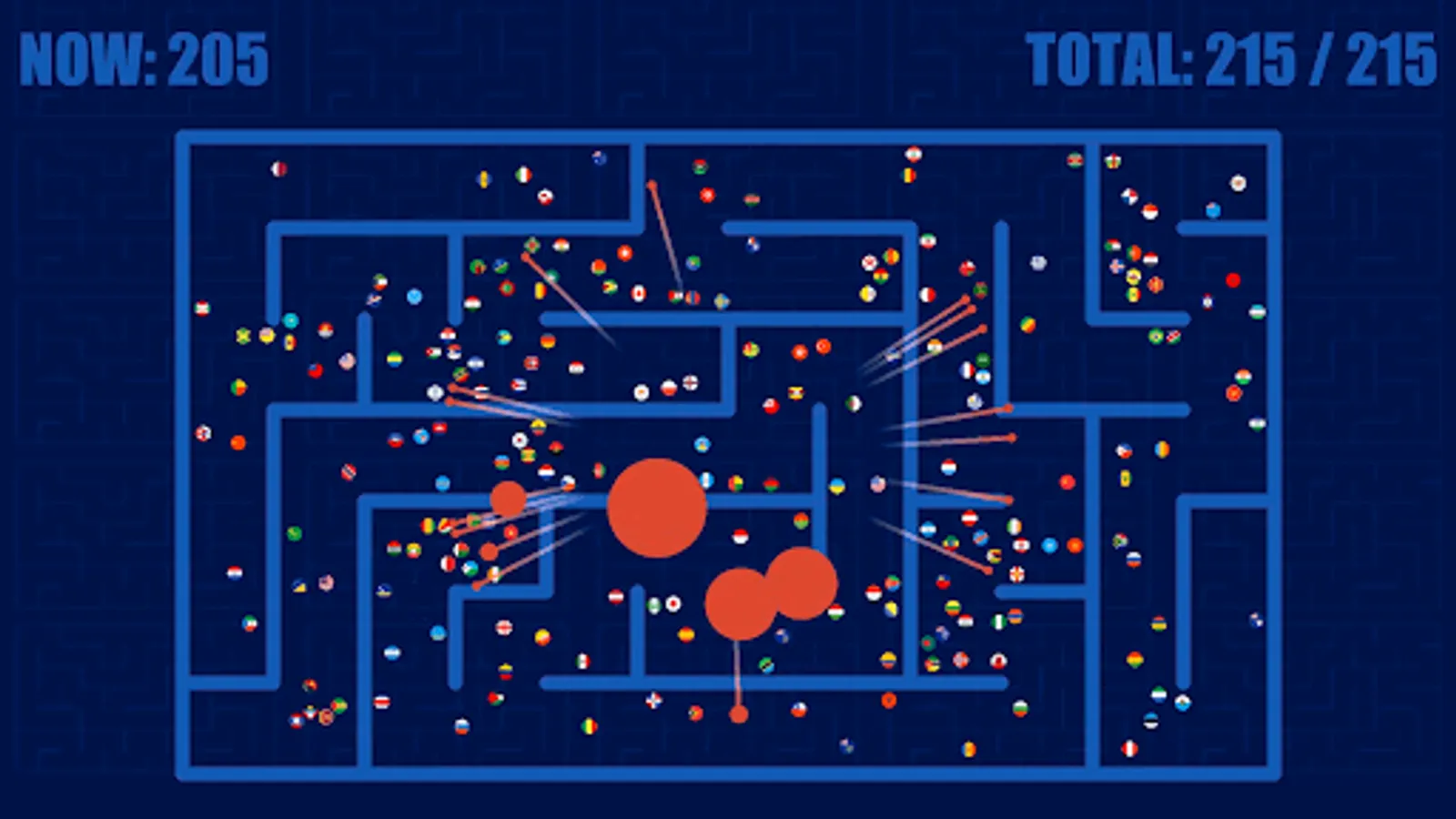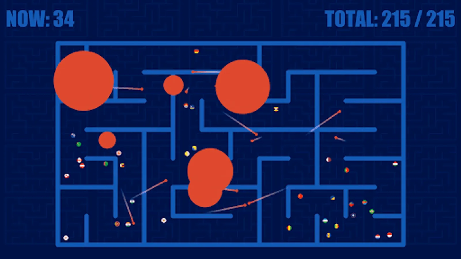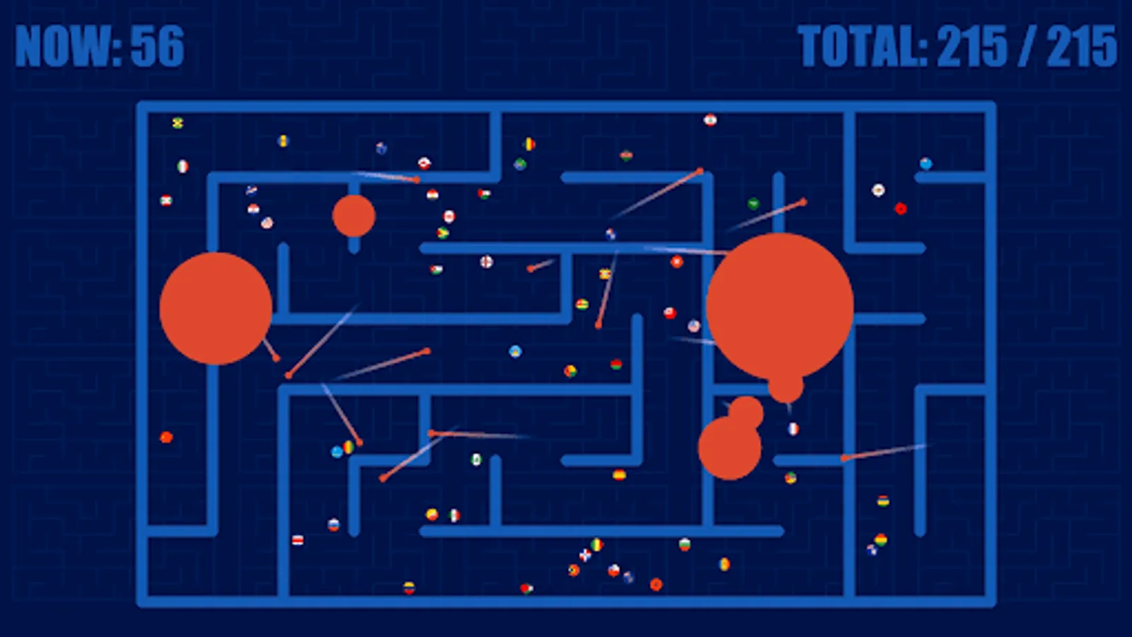 Maze marble race initially involves 215 countries. Exploding balls fly across the field, which carry countries that have fallen under the explosion to the next level. The last country in the level is eliminated. The game lasts until the last winning country