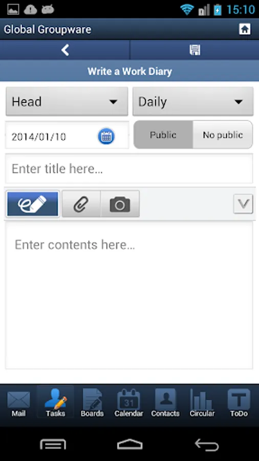 Tasks include Work Diary and Task Report. You can share your work with your colleagues by using work diary function.