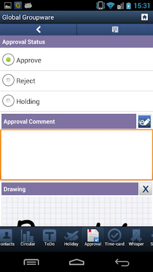 Approval, you can use this function, if you have work suggestions to get approved with e-signing by also using hand writings on your mobile.