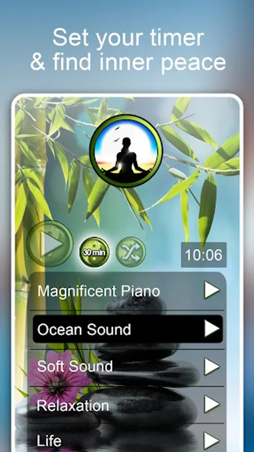 Do you need to relax after a stressful day? Find your inner peace and play soothing melodies. This beautiful app is called Relaxing Music - Sounds for Meditation - Sleep Sound and it has everything you need to calm your mind. Download this “ambient music” that provides great music background in the form of relaxing sounds. Enjoy listening to “meditation music for relaxation” to keep calm and relieve stress. Use this relaxing music for sleeping and you will learn how to reduce stress. You can even try to listen to sound sleep and meditation music to sleep. Download this amazing music for meditation and find your favorite reiki sound, music for yoga and “meditation music relax”. Take a deep breath and listen to reiki music and calm sounds. This “soothing music” will help you find inner peace and release stress. Yoga is a perfect way to improve health and our app is a perfect way to relax and enjoy your meditation. Download “Relaxing Music” - “Sounds for Meditation” - “Sleep Sound” and enjoy listening to stress relief music app offline.