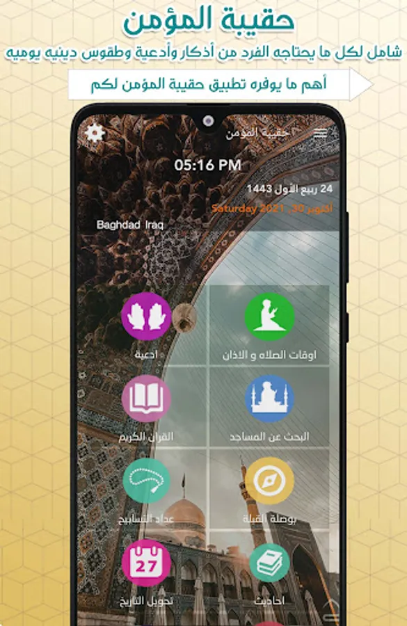 - Hijri and Gregorian date: The complete insured bag displays the Hijri and Gregorian dates and displays all occasions and holidays.