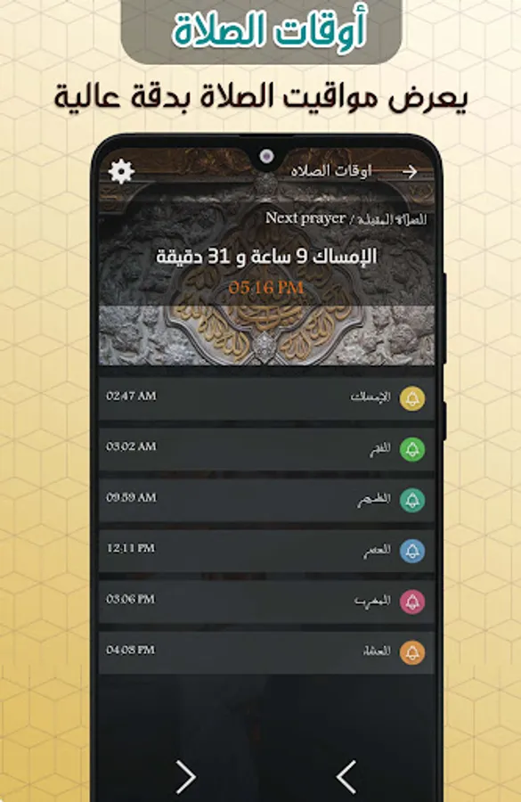- Prayer times: It is a wonderful service to know the times of the five daily prayers, as there is a service for the call to prayer at the times of prayer with an alert to the time of the approaching call to prayer in order to increase the alertness and interest in making up for your prayers.