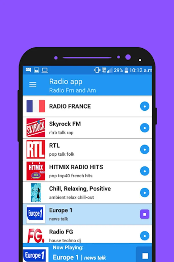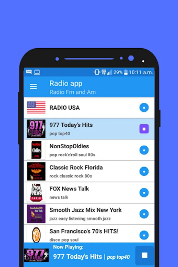 Radio app is an online radio application that allows you to LISTEN LIVE stations from different countries. With a modern, elegant and easy-to-use interface, the app gives you the best experience when it comes to listening to your favorite music anytime, anywhere and it's completely FREE!