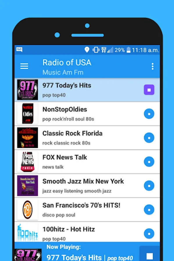 Radio of USA is an online radio application that allows you to LISTEN LIVE to all U.S. stations. With a modern, elegant and easy-to-use interface, the application gives you the best experience when listening to your favorite music anytime, anywhere and it's completely FREE!