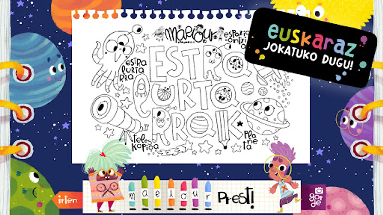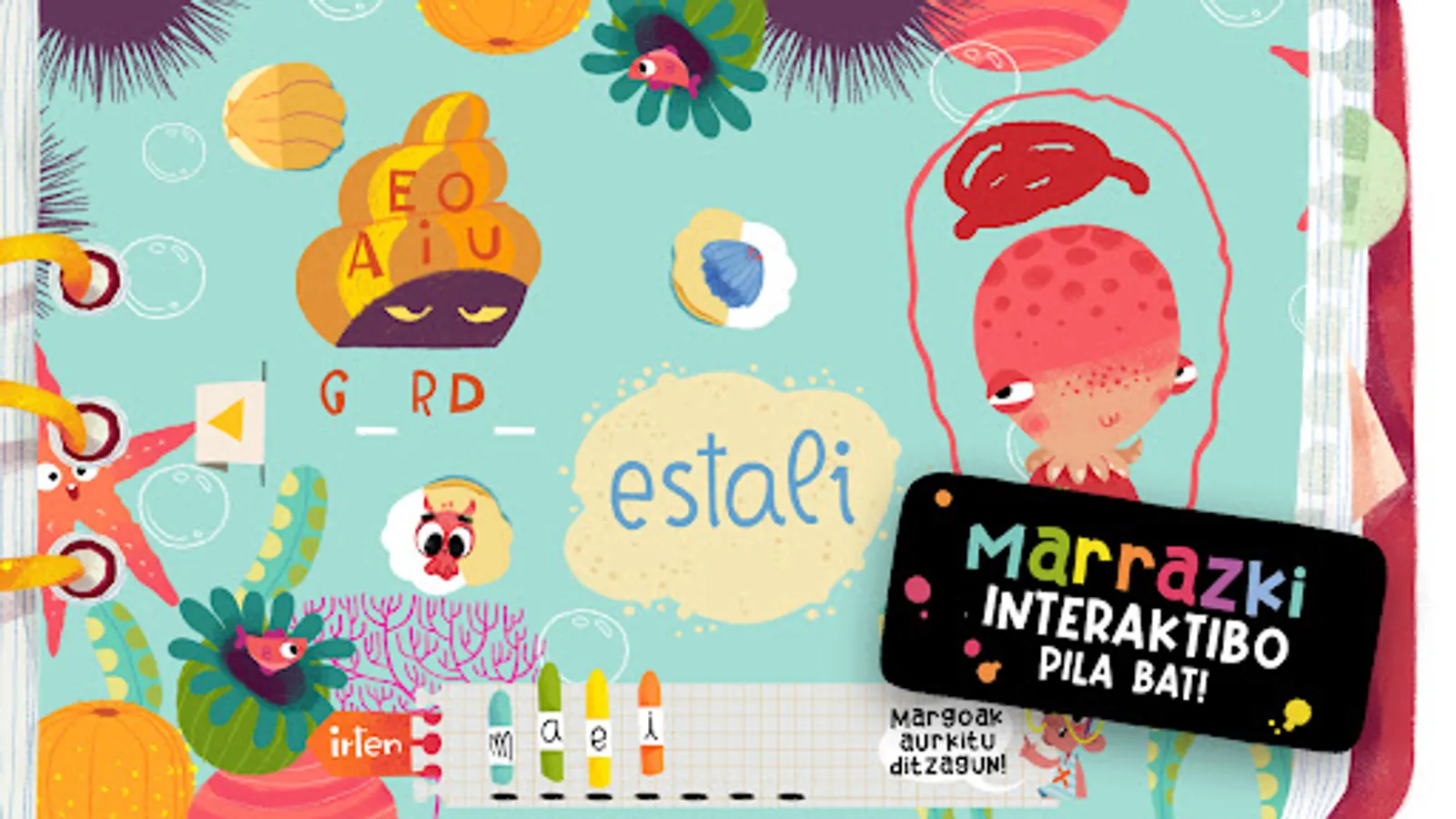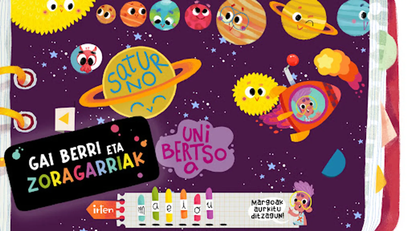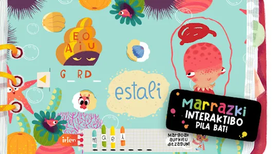 • We will discover new topics with the help of wonderful drawings and learning new Basque words: Metamorphosis, Honey, Water cycle, Fossils, Solar system, Birth of the Moon, Extraterrestrials, Colors, Numbers,...
