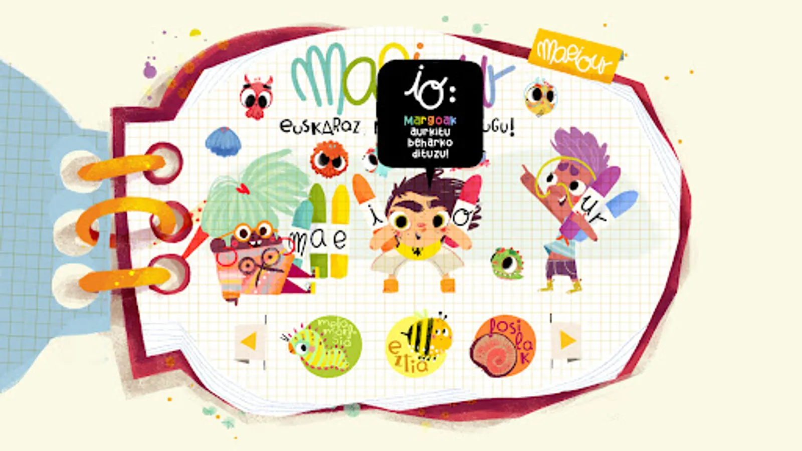 In the game MAEIOUR, creative children Mae, Io and Ur will show us new themes. Vivid and imaginative themes related to nature, the universe, paintings and imagination: Metamorphosis, Night, Fossils, Colors, the birth of the Moon, Honey, the Water cycle, Numbers, Coconuts,...