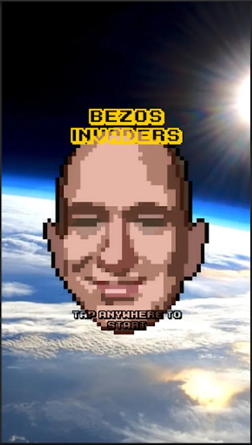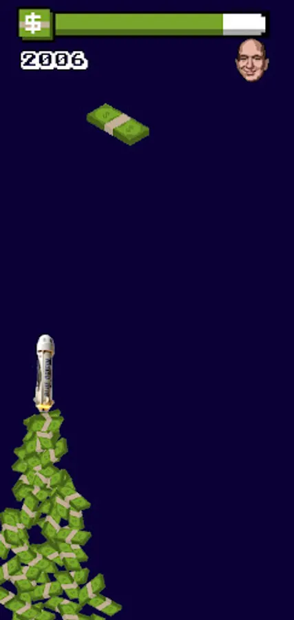 The story revolves around Jeffrey Bezos and the Bezos Invaders trying to invade space in their ship, New Shepard, whose fuel is money that is constantly being collected during the flight to maintain flight.