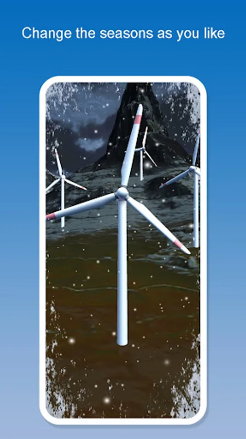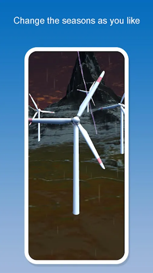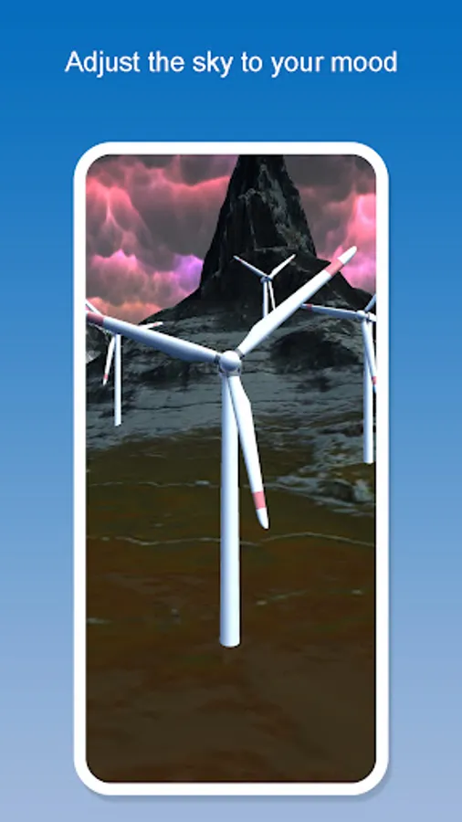 You can watch beautiful wind turbines in action, start rain or snow to create a serene atmosphere, and even change the sky to your liking. Whether you're relaxing at home or on the go, our app brings the relax with wind turbines right to your fingertips.