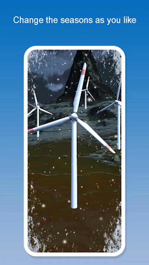 These wind turbines can be slower or faster so you can watch enjoyable. You can set the wind turbine's speed. You can change the sky. You can start or stop the rain and snow. You can hear lightning sounds sometimes. You can hear wind sounds.