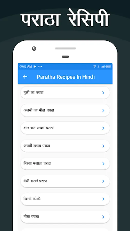 There many paratha recipe is… * मक्के के आलू भरे पराठे * मेंथी के पराठे * गाजर के पराठे * स्वीट कार्न पराठा * सिन्धी कोकी * पनीर के पराठे * दाल चावल के पराठे * पिज्जा पराठा * केरला पराठा * पालक के पराठे * गोभी के पराठे, and many more….